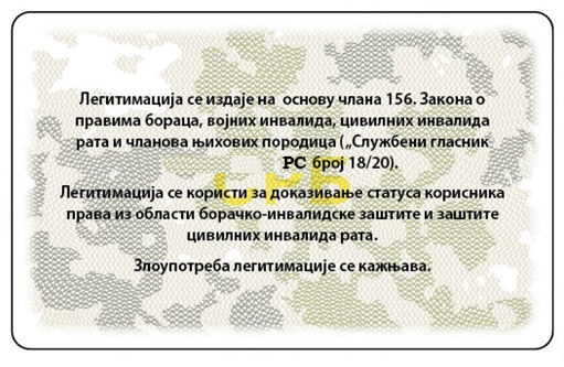 На полеђини легитимације је текст: „Легитимација се издаје на основу члана 156. Законa о правима бораца, војних инвалида, цивилних инвалида рата и чланова њихових породица („Службени гласник Републике Србије“, број 18/20). Легитимација да се користи за доказивање статуса корисника права из области борачко-инвалидске заштите и заштите цивилних инвалида. Злоупотреба легитимације се кажњава.“.